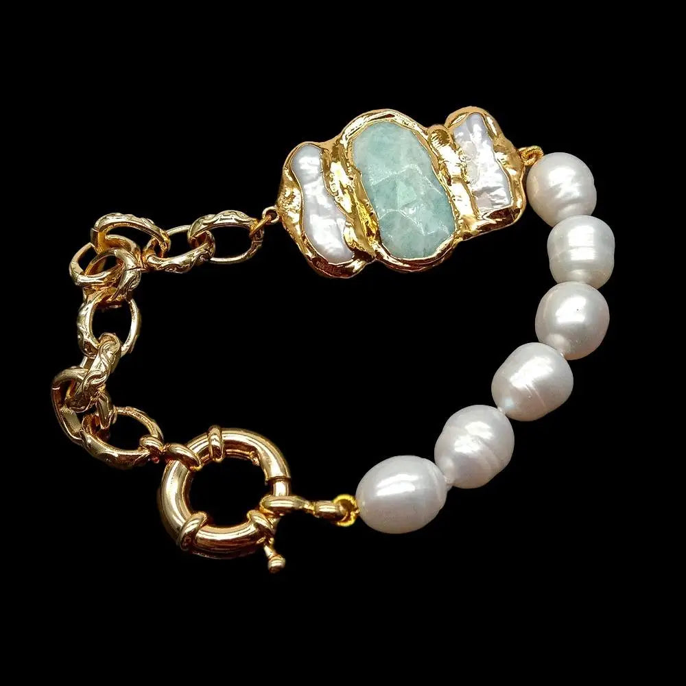 There's something magical about the way freshwater pearls catch the morning light—each one unique, shaped by time and nature's gentle hand. This vintage-inspired bracelet brings together luminous white rice pearls with the serene blue-green hues of amazonite, creating a piece that feels both timeless and deeply personal.