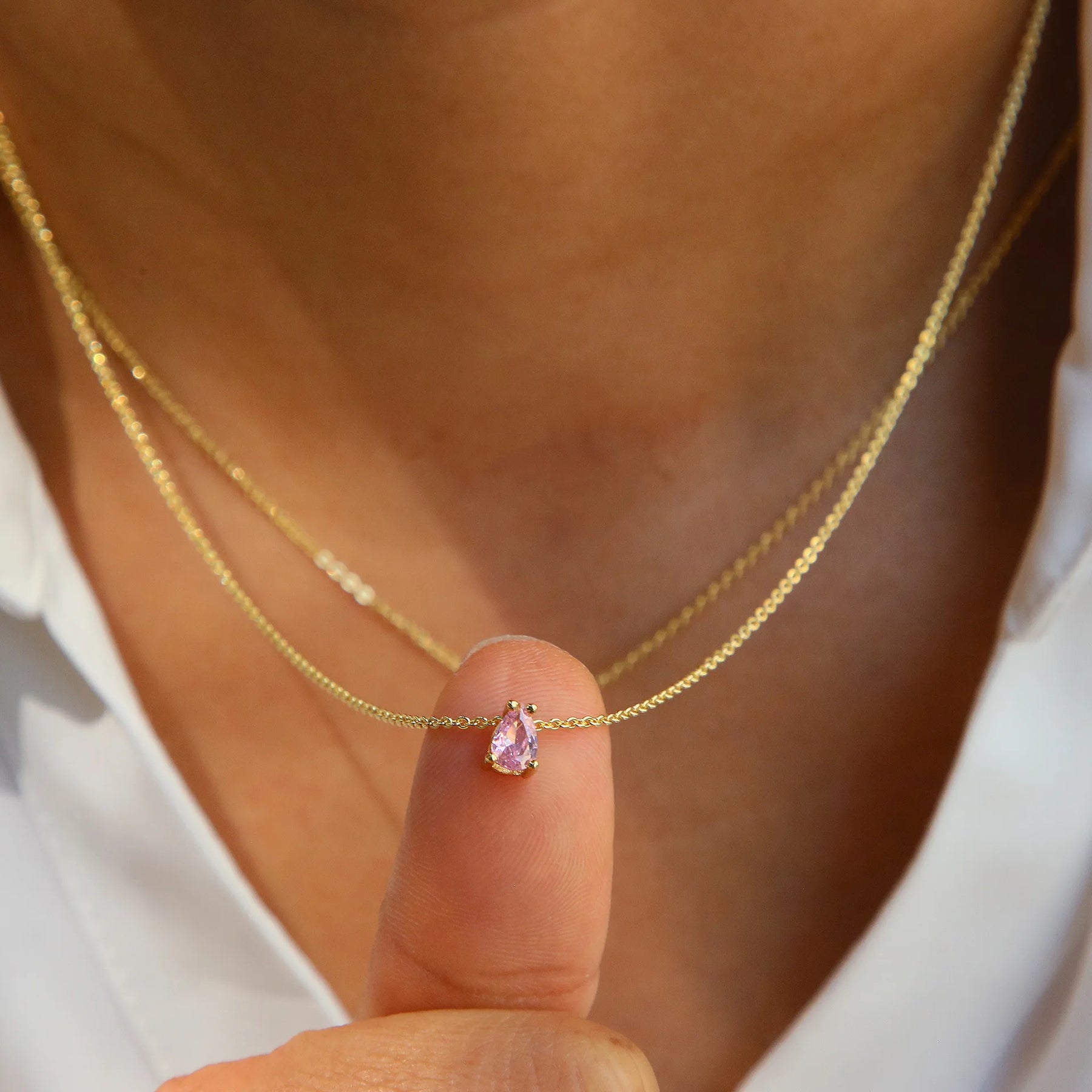 Each morning, as light catches the faceted surface of this teardrop crystal, you're reminded of life's most precious moments. This delicate birthstone necklace carries the essence of your birth month, transformed into a shimmering drop of light that rests close to your heart.